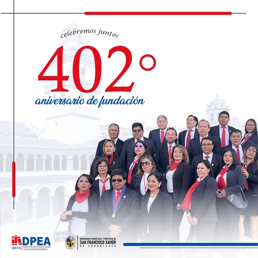 La Dirección de Planificación y Evaluación Académica tiene el alto honor de expresar su más profunda y sincera felicitación a nuestra Universidad Mayor, Real y Pontificia de San Francisco Xavier de Chuquisaca en la conmemoración de su 402° aniversario de fundación. 🔴🔵