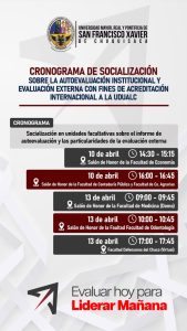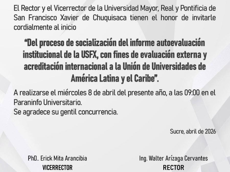 La Universidad Mayor, Real y Pontificia de San Francisco Xavier de Chuquisaca invita a toda la comunidad al inicio del proceso de socialización del informe de autoevaluación institucional. Este es un paso firme hacia la excelencia académica y la acreditación ante la Unión de Universidades de América Latina y el Caribe (UDUALC).